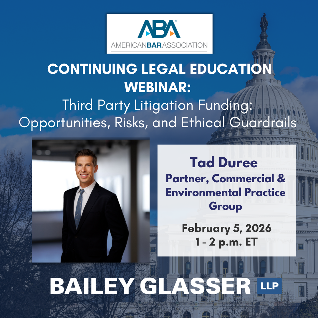 Bailey Glasser litigator Tad Duree is presenting at an American Bar Association CLE entitled: “Third Party Litigation Funding: Opportunities, Risks, and Ethical Guardrails.” The program is taking place on Thursday, April 5, 2026, at 1 p.m. ET.